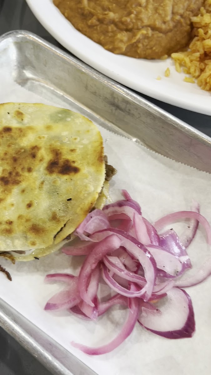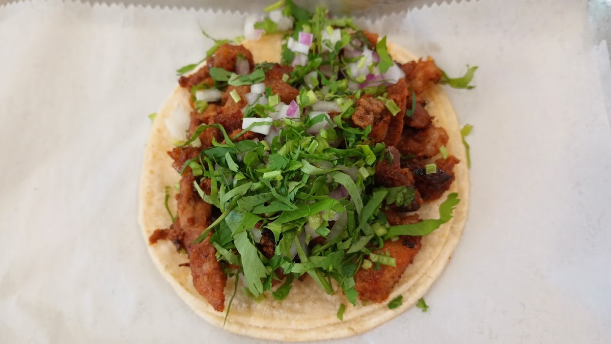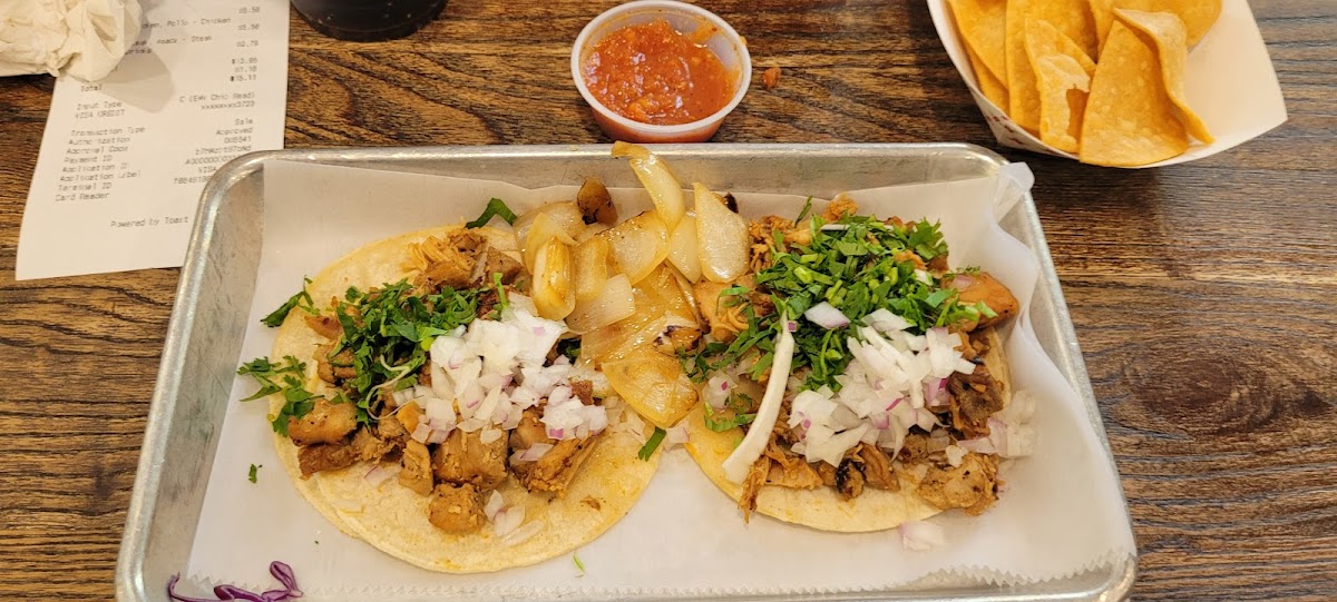 Really good Mexican food. I tried the taco plate and got one hard taco and one soft. Both were tripa. The menu doesn’t state this, but apparently tripa is $1 extra as they charged extra when I viewed my receipt. Only criticism is that the menu should be updated to reflect which meats cost extra. Both tacos were good but the hard one surprisingly is the best. My friend had advised me and she wasn’t wrong! The rice and beans have great flavor, and they also have the chips and salsa bar.